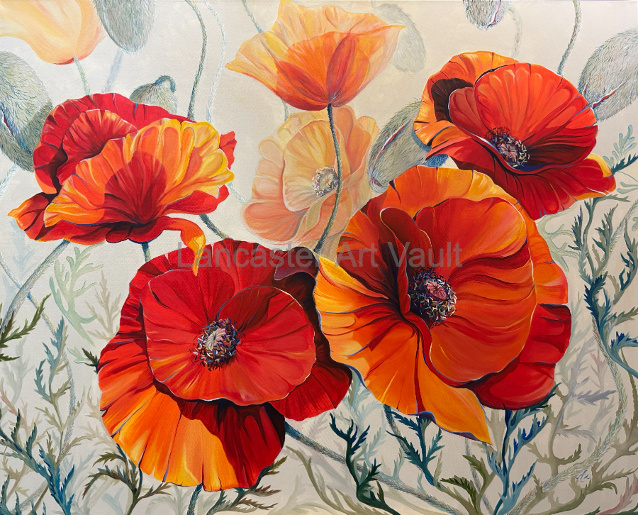 Vibrant orange poppy blooms burst to life, their delicate petals unfurling amid twisting stems and budding blossoms. The composition dances with movement, as the curved lines of the foliage guide the eye across the canvas.